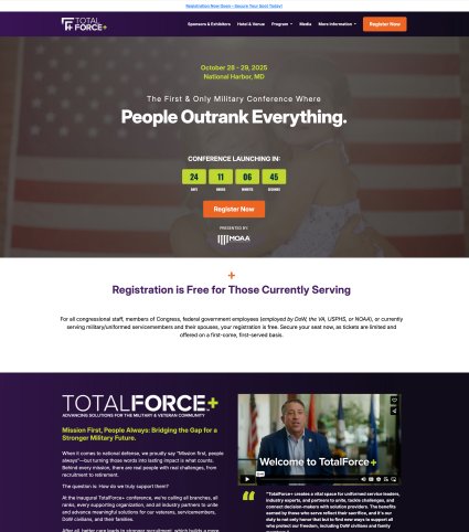 Led the marketing + communications strategy for the Military Officers Association's first national conference, guiding a cross-functional team through every stage of the brand launch. Partnering closely with designers, writers, + marketing specialists, I leaned on their expertise to shape the creative vision — from logo + website creation to paid, social, + email campaigns. I also built partnerships with outside vendors + internal stakeholders to ensure the messaging, visuals, + experience (including signage, media outreach, + the influencer lounge) all reflected one cohesive brand story: totalforceplus.org